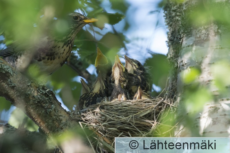 13409 Räkättirastas, Turdus pilaris, poikue, pesä, vaakakuva