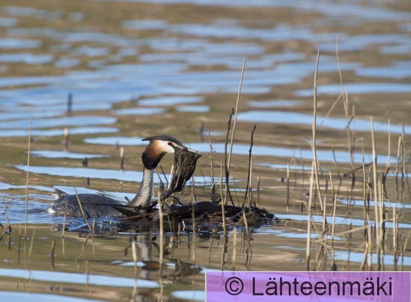 13411 Silkkiuikku, Podiceps cristatus, pesän rakennusta, vaakakuva