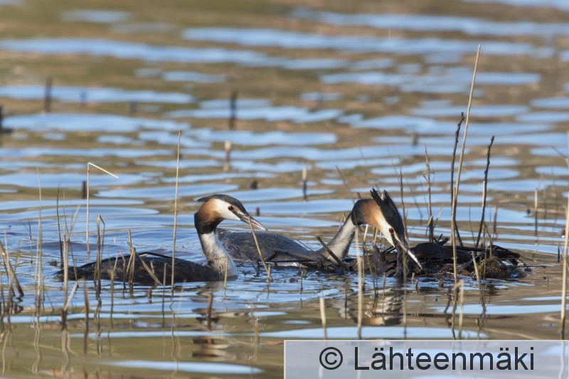 13410 Silkkiuikku, Podiceps cristatus, pesän rakennusta, vaakakuva