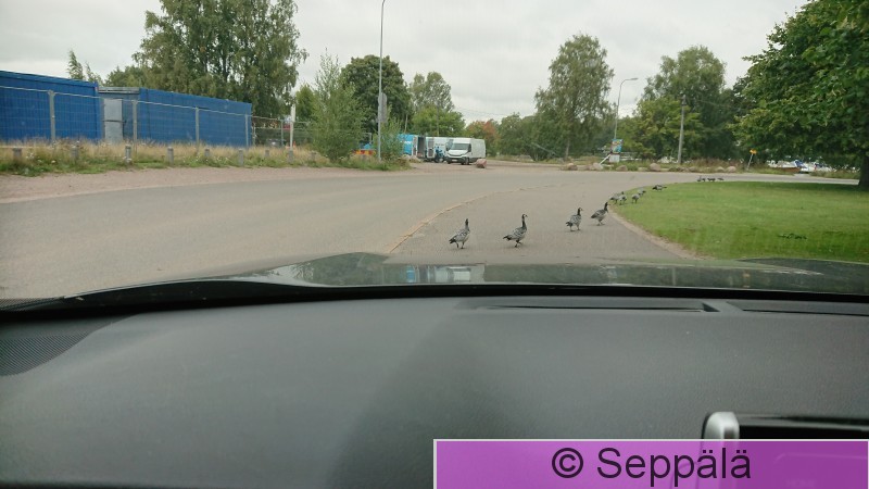 Helsinki Töölö Uloste asfaltilla. Hanhilauma väisti juuri sivummalle, kun saavuin paikalle.