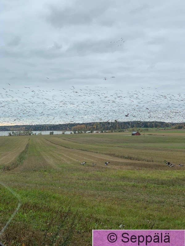 Iitti Tuhansia valkoposkihanhia viivähtää syysmuutolla Itä-Suomen pelloilla. Kuva Anitta Töyrylä.