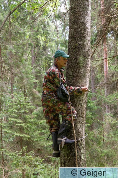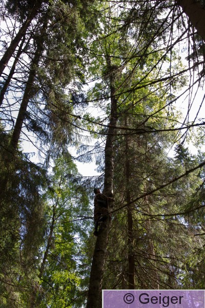 Kangasala Rengastaja Jyrki Savolainen kiipeämässä Pirkanmaan ensimmäiselle haarahaukan pesälle.