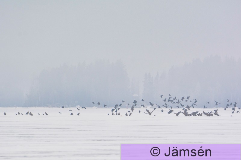 Lempäälä Säijänselkä Merikotkia ja korppeja kokoontuneena syömään kalastajan jättämiä kaloja. Kuvassa yli 20 merikotkaa.