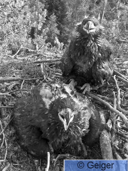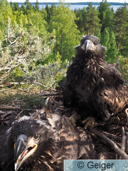 Orivesi, Längelmävesi Merikotkan pesäpoikaset ovat juuri saaneet Jyrki Savolaisen renkaat nilkkaansa. Kuvaaja Jyrki Savolainen.