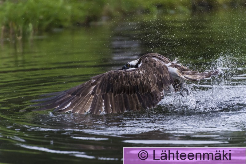 Kangasala Pohtiolampi Sääksi on saanut liian painavan kalan, eikä ole jaksanut nousta ilmaan. Sen vuoksi lintu on raahannut kalan maalle.