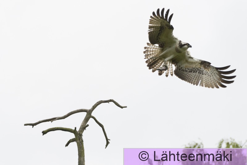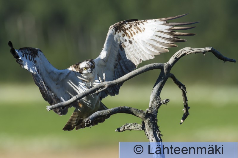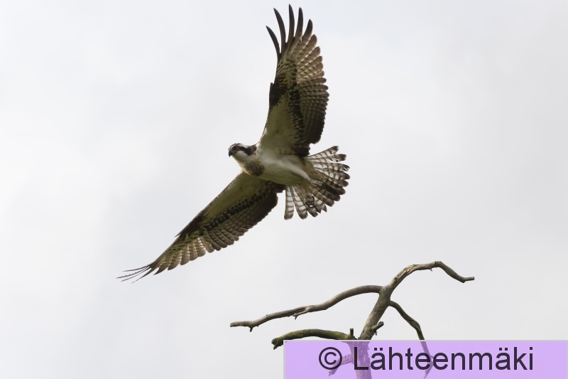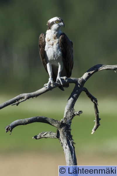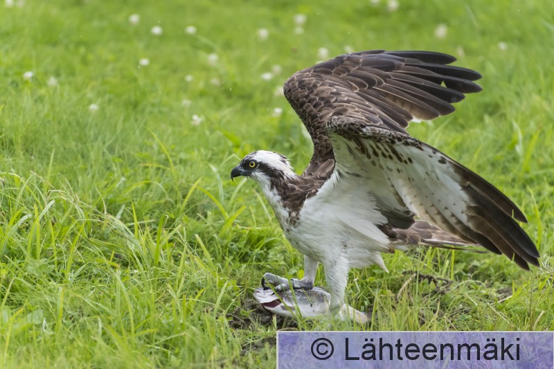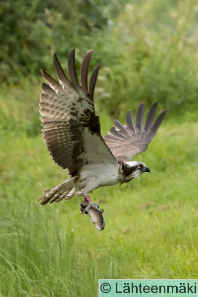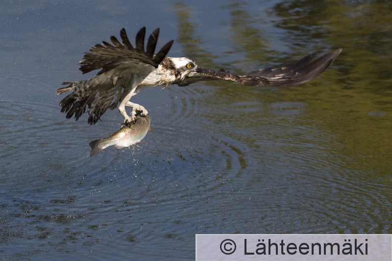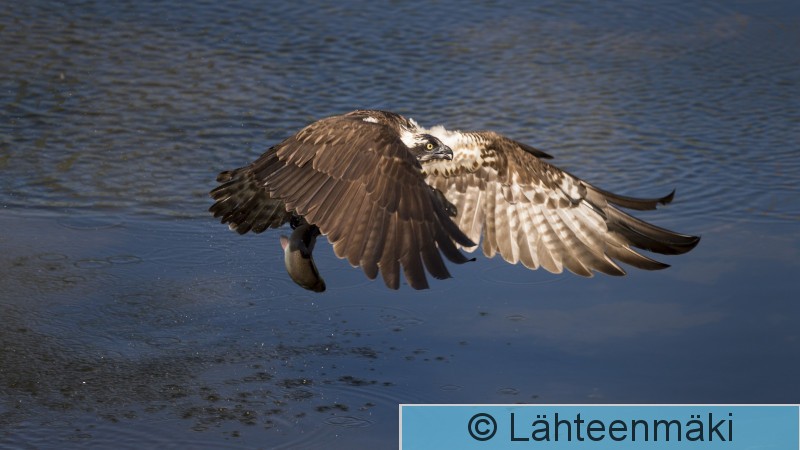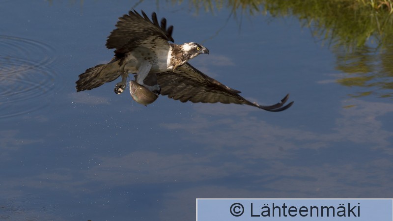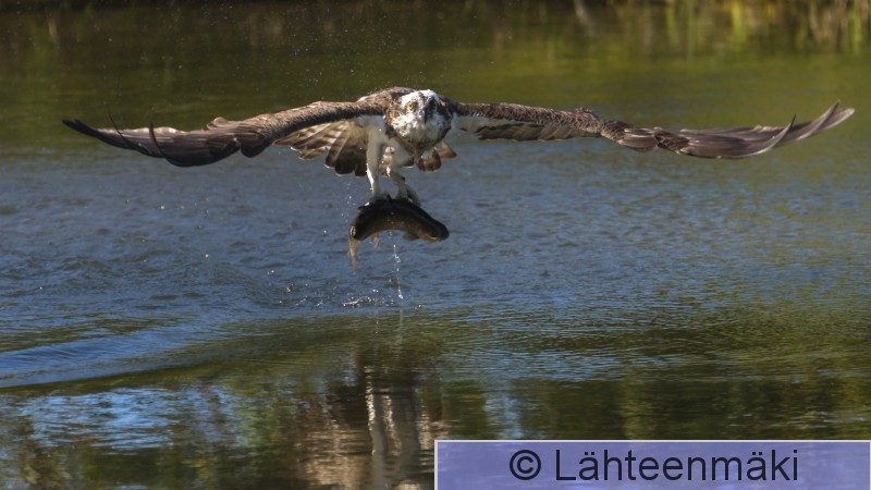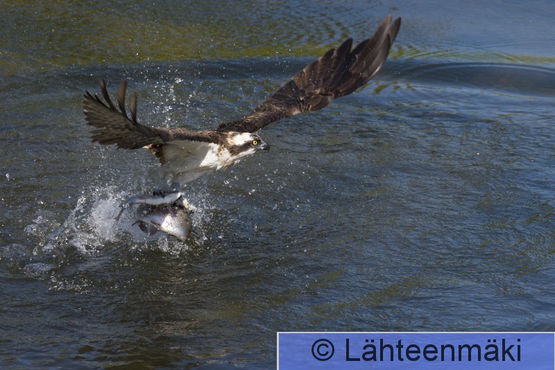Kangasala Pohtiolampi Sääksi on saanut kynsiinsä kaksi kalaa kerrallaan.