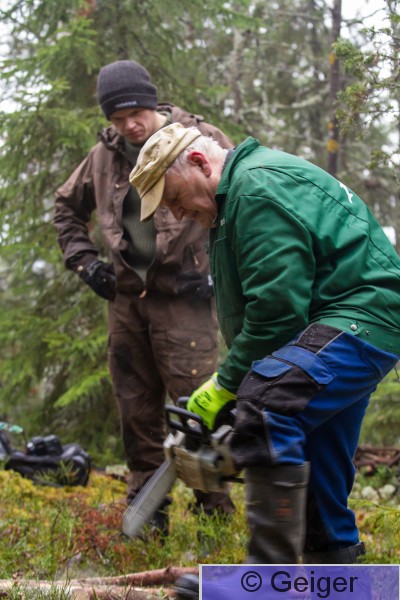 Kangasala Heponiemi Sääksisäätion toiminnanjohtaja Juhani Koivu sahaa kuusenrankoja sääksen tekopesää varten. Taustalla Joona Koskinen.