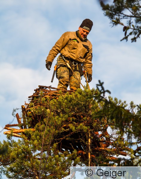 Kangasala Heponiemi Harri Koskinen testaa juuri valmistuneen sääksen tekopesän tukevuutta nousemalla sen päälle seisomaan.