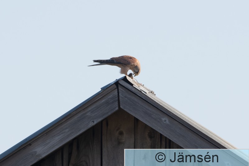 Vesilahti Ylämäki Tuulihaukka syö myyrää ladon katolla.