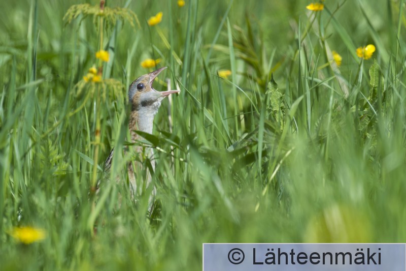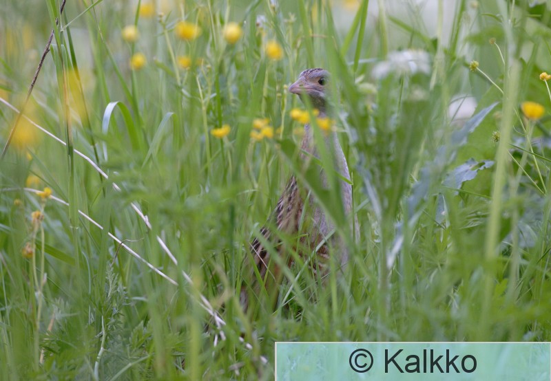7631 Ruisrääkkä, Crex crex, piileskelee, laulaa, vaakakuva