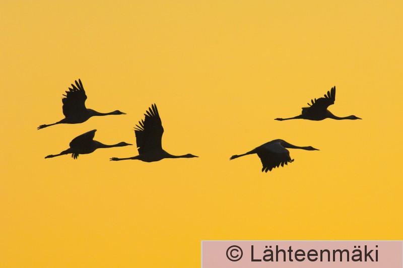 479 Kurki Grus grus parvi lentää silhuetti aamuaurinko