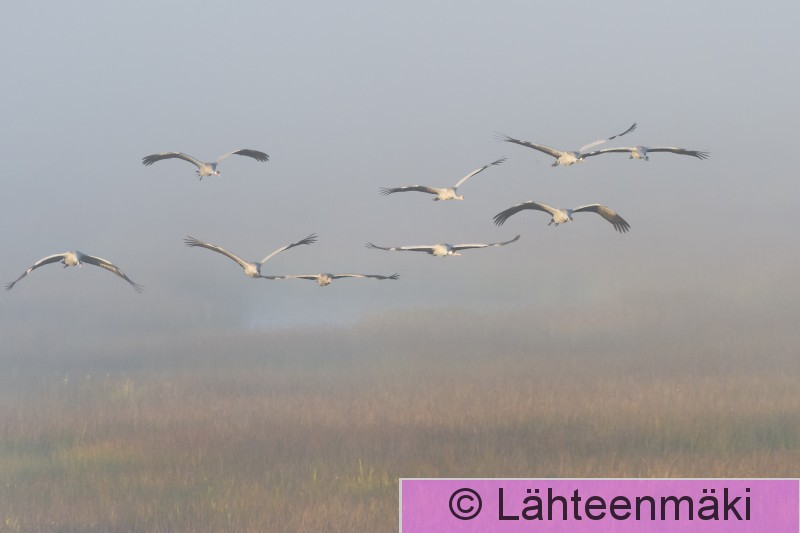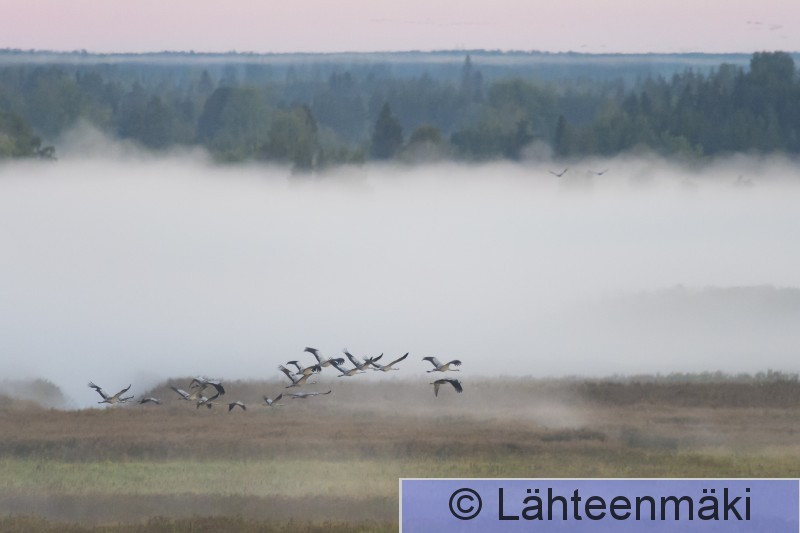 Kokemäki Puurijärvi Kurkiparvi lentää aamusumussa Puurijärvellä.