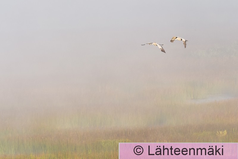 Kokemäki Puurijärvi Kurkipari lentää aamusumussa Puurijärvellä.