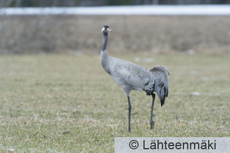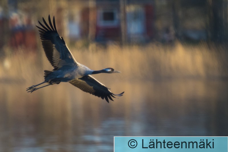 Kokemäki Puurijärvi Kurki lentää taustalla maatilan rakennuksia.