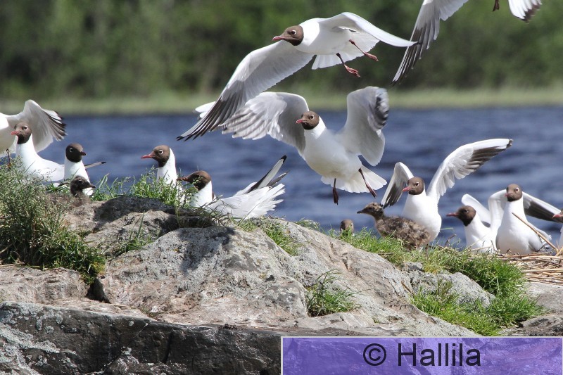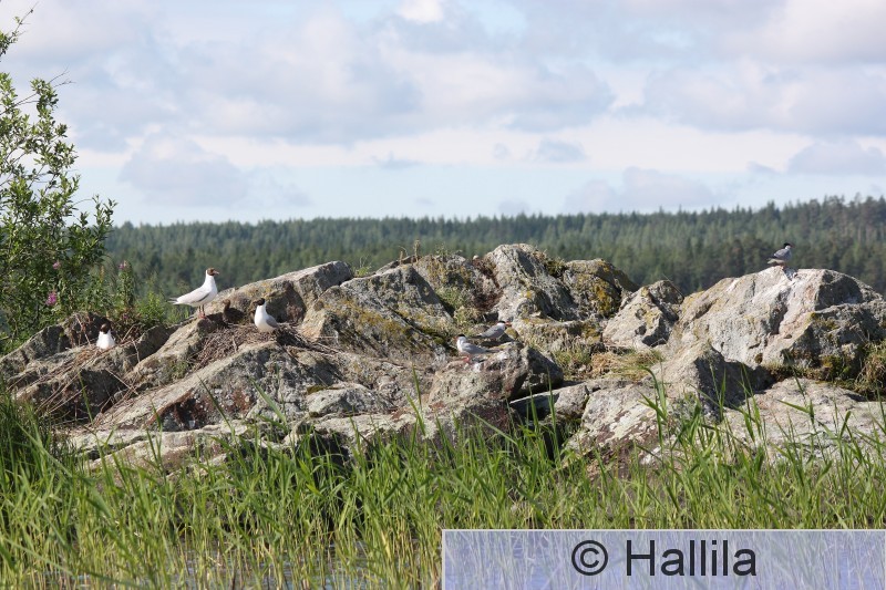 Ruovesi, Visuvesi, Aittossaresta S Osa Visuveden Aittosaaren eteläpuoliselta pesimäluodolta. Ko. vuonna luodolla pesi yli 40 paria naurulokkeja ja noin 10 paria kalatiiroja. Pesinnät onnistuivat hyvin - kuvassa näkyy jo melko kookkaita poikasia. Kalatiirat pesivät korkeimmalla kohdalla.