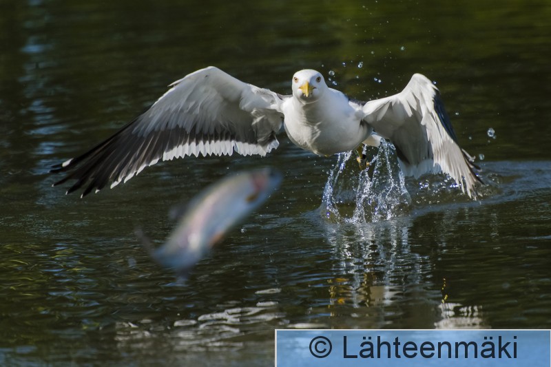 Sarsa saalisallas Lokki uittaa ison kalan rantaan ja nostaa sen penkereelle mahtiateriaksi.