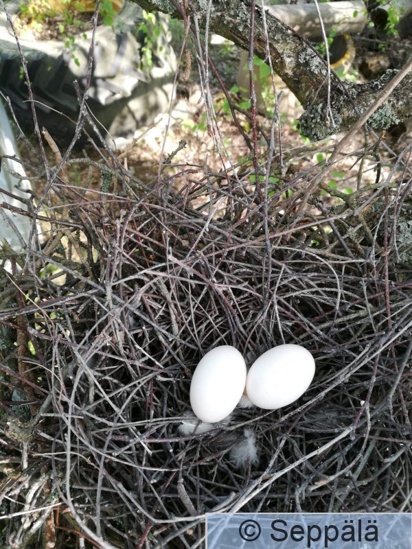 Pälkäne Myttäälä Sepelkyyhkyn pesä ulkorakennuksen vieressä.