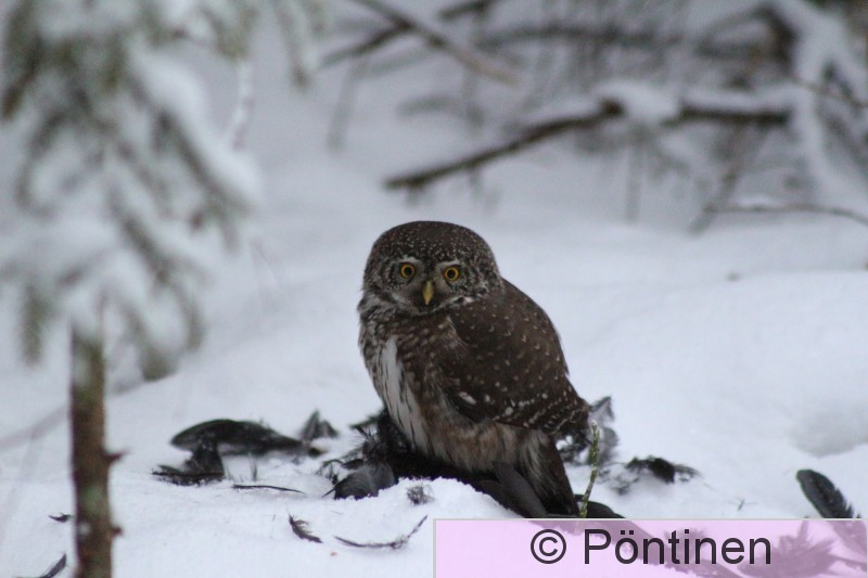 Suolijärven luontopolku, Ahvenisjärventien lähellä Varpuspöllö oli napannut saaliikseen mustarastaan lintujen ruokintapaikalla. Pöllö oli pienempi kuin saaliinsa. Pöllöllä näytti olevan kova nälkä, myyriä se ei ollut onnistunut saaliikseen saamaan.