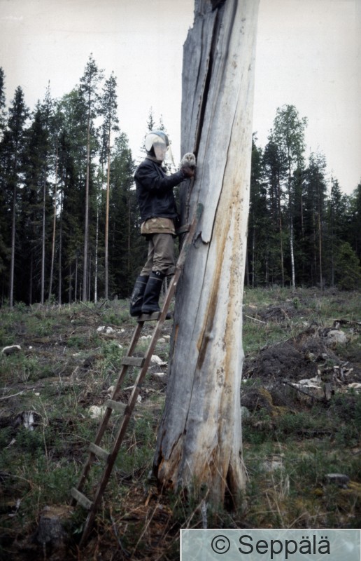 Ikaalinen Karpanperä Pöllötutkija Martti Lagerström viirupöllön pesällä. Kelossa oli 6 poikasta.