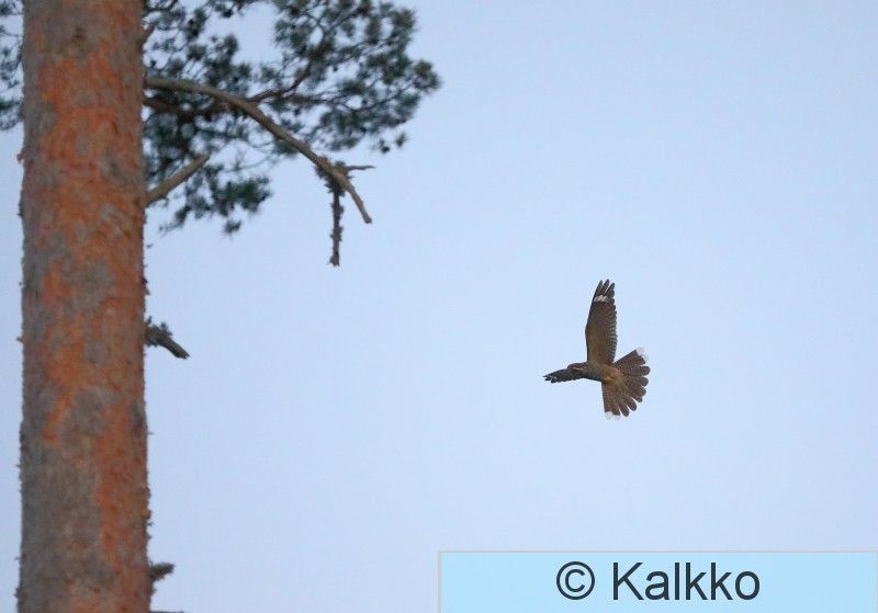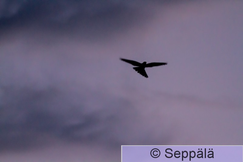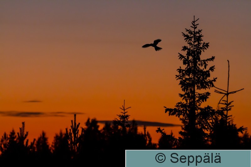 Ruovesi Siikakangas Kehrääjä lentää yötaivaalla, siluettikuva.