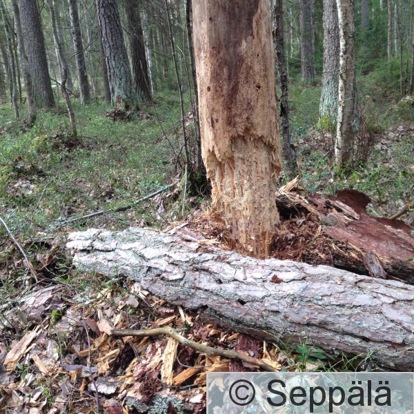 Pälkäne Uusi-Mälkilä Palokärki on etsinyt syötävää tästä ohuesta lahopuusta. Silput on revitty irti ronskisti ja ne ovat isoja, mikä paljastaa tekijän.