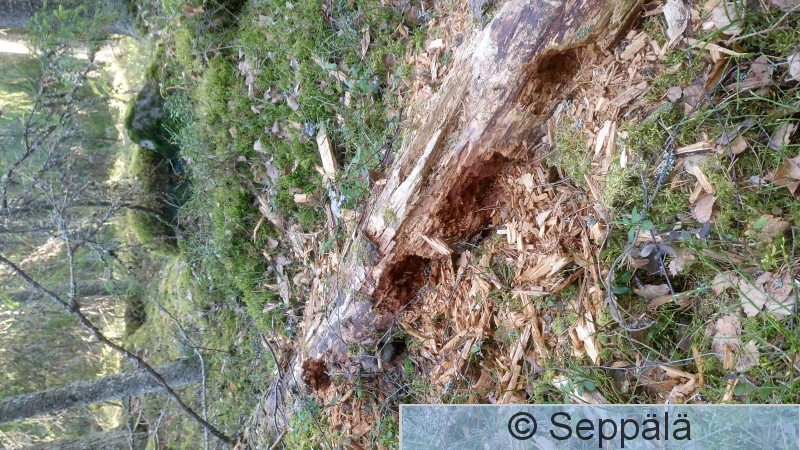 Pälkäne Äimälä Mustanlahdenmäen luonnonsuojelualue Palokärki on kaivanut hyönteisiä lahopuusta.