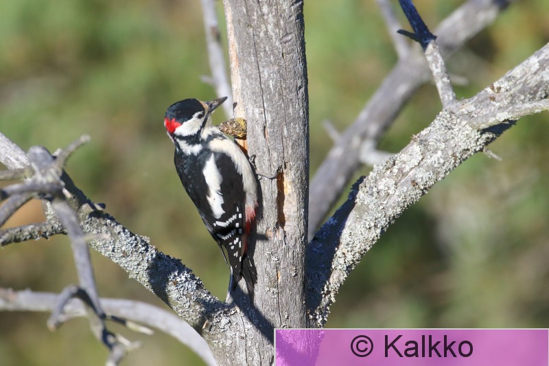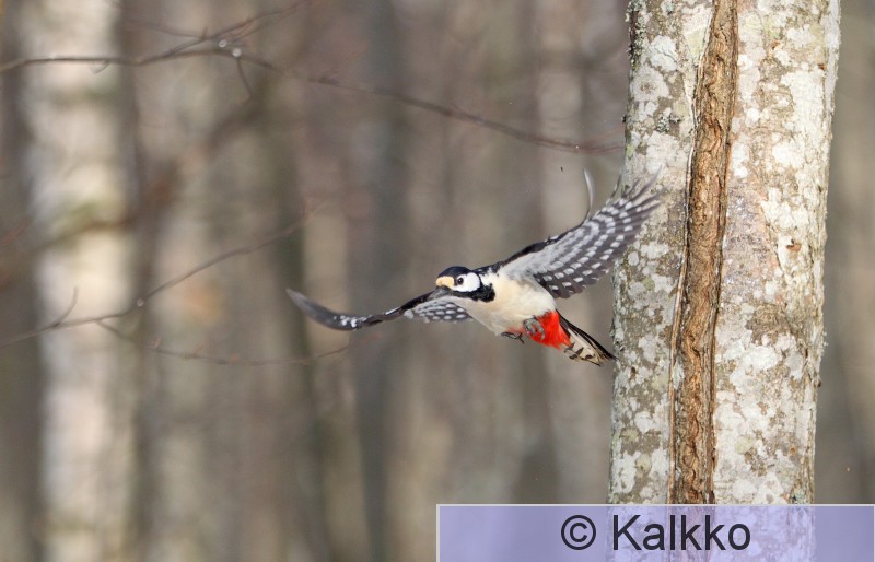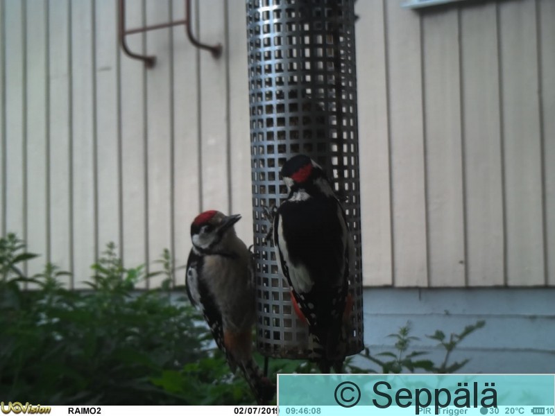 Vihti Vihtijärvi Käpytikka nähtiin hakkaamassa tätä suuaukkoa. Metallilevy näyttää liian ohuelta. Kuvaaja Petri Kanervo.