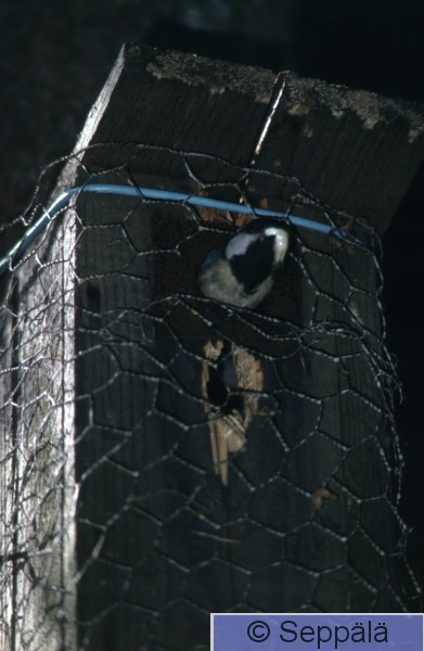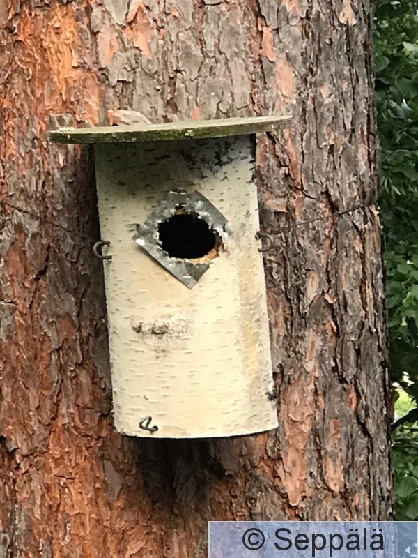 Ikaalinen Luhalahti Pääniemi Talitiainen kuljettaa pois poikasten ulosteita. Käpytikka yritti ryöstää poikaset, mutta estin sen katiskaverkolla.