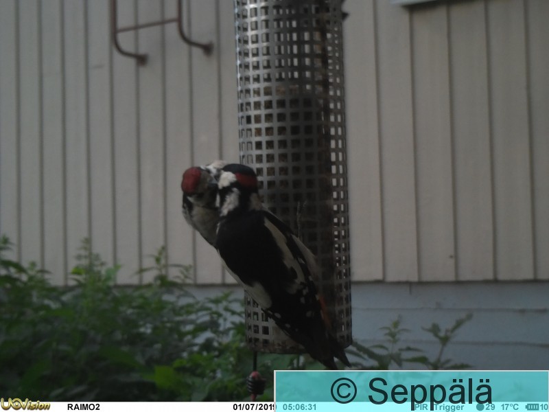Juupajoki, Huikonjoki Riistakamera kuvasi käpytikat metsäruokinnalta. Koiras on tuonut kaksi nuorta syömään.
