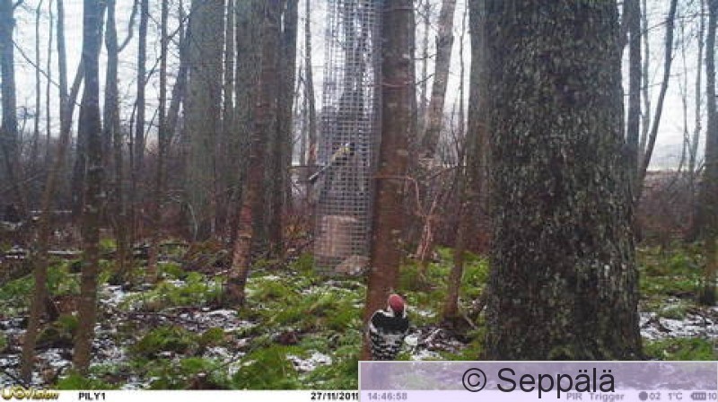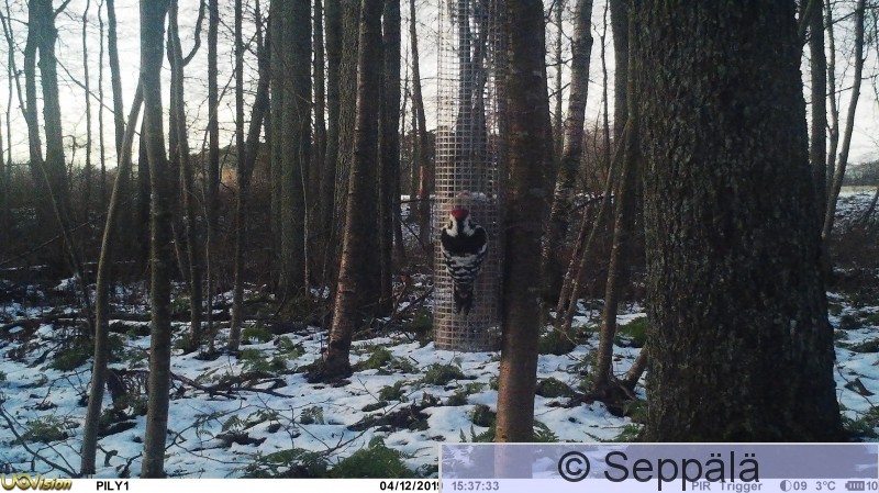 Pälkäne Myttäälä Riistakamera kuvasi valkoselkätikan ruokinnalta.