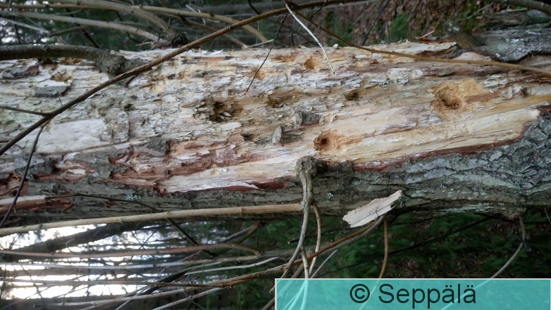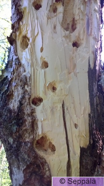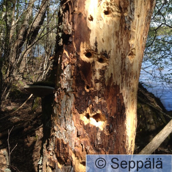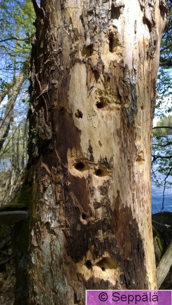 Pälkäne Äimälä Mustalahti Valkoselkätikan syöntijälkiä. Keskellä pökkelöä näkyy hieman vanhempia, mutta vasemmassa ja oikeassa reunassa hyvin tuoreita. Kuvaaja Jouko Kemppainen.