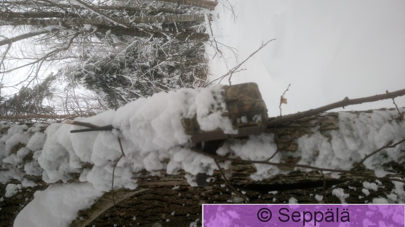 Kangasala Kuohenmaa Valkoselkätikkaetsinnöissä ollut riistakamera lumipyryn jälkeen.