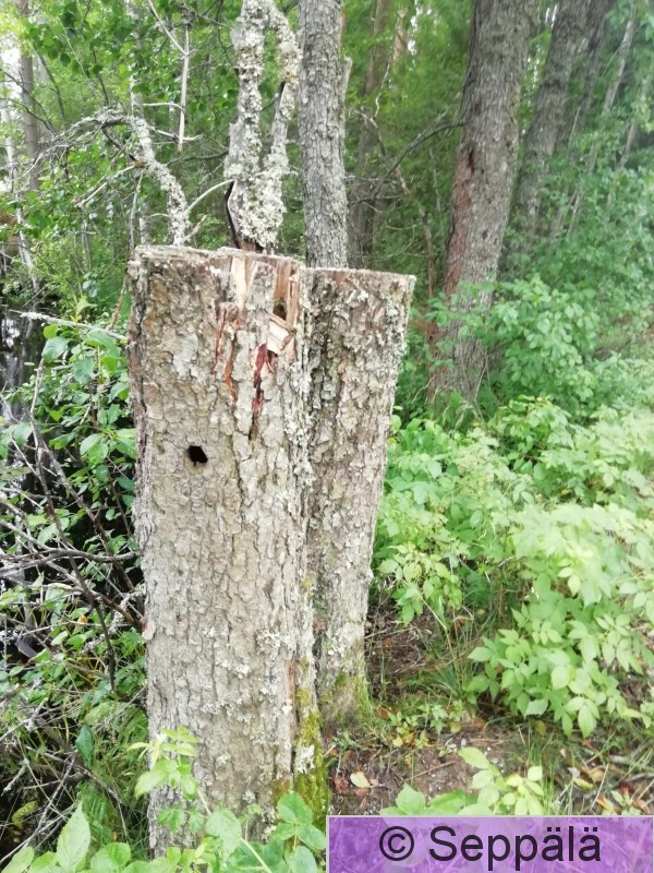 Kuhmoinen Leppäpökkelö, jossa pikkutikka pesi 0,5 m korkeudella n. 2015.