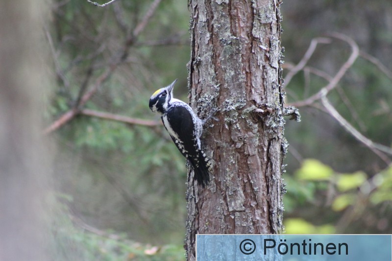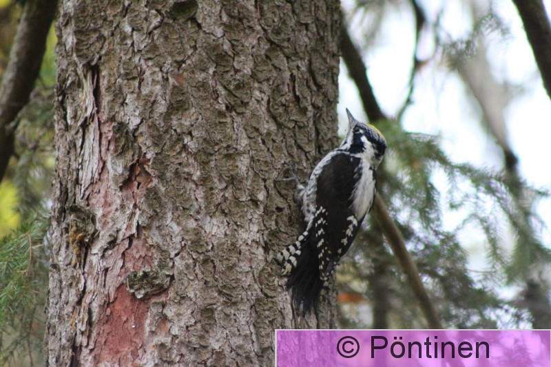 Hervanta, Suolijärven luontopolun metsikkö Huomasin pohjantikan puunrungolla 13.1.2018. Se etsi syötävää puuta nakutellen, ja heitteli nokallaan pois kaarnanpaloja.