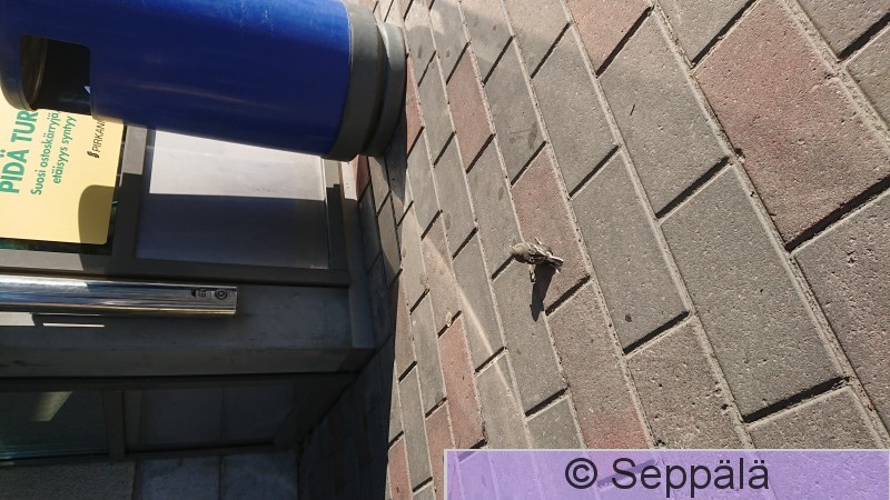 Pälkäne keskusta Juuri pesästä lähtenyt västäräkin poikanen S-Marketin ulko-oven vieressä. Emo varoitteli.