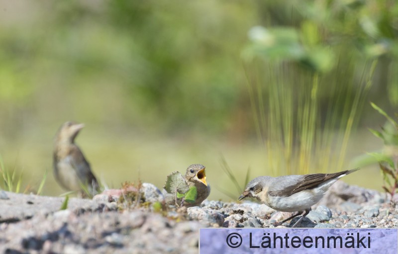 6716 Kivitasku, Oenanthe oenanthe, maastopoikanen, perhe, poikasen ruokinta, naaras, vaakakuva