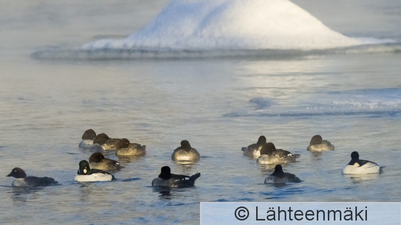 3118 Telkkä, Bucephala clangula, parvi, koski, talvehtiminen, talvi, vaakakuva