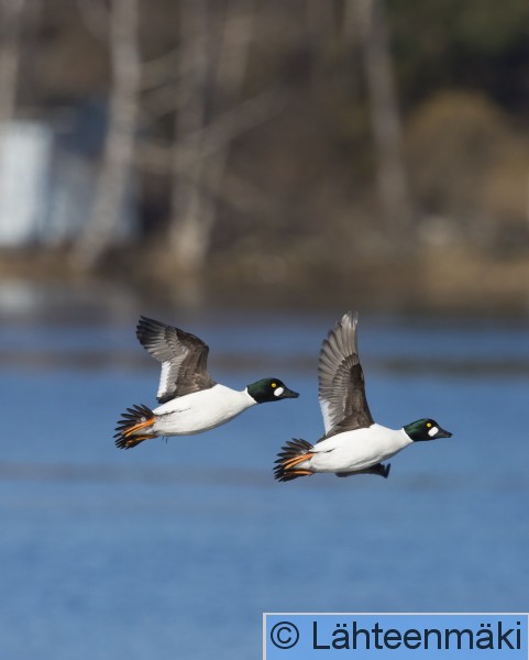 5572 Telkkä, Bucephala clangula, parvi. lentää, vaakakuva