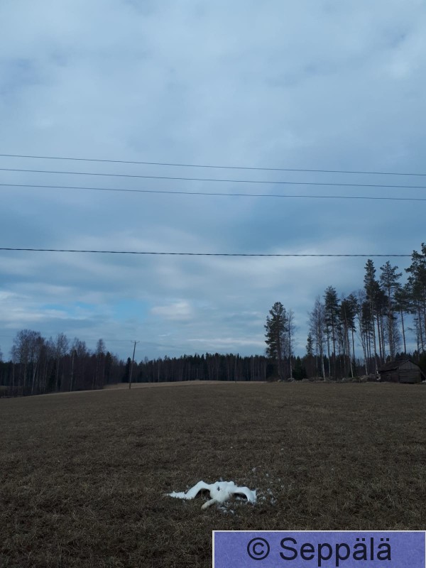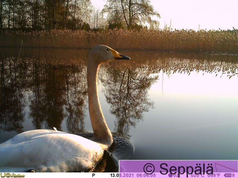 Kangasala Saarikylät Riistakamera oli kiinnitetty metallisen kolmijalan huipulle rantaveteen, ja se herätti joutsenen kiinnostuksen.