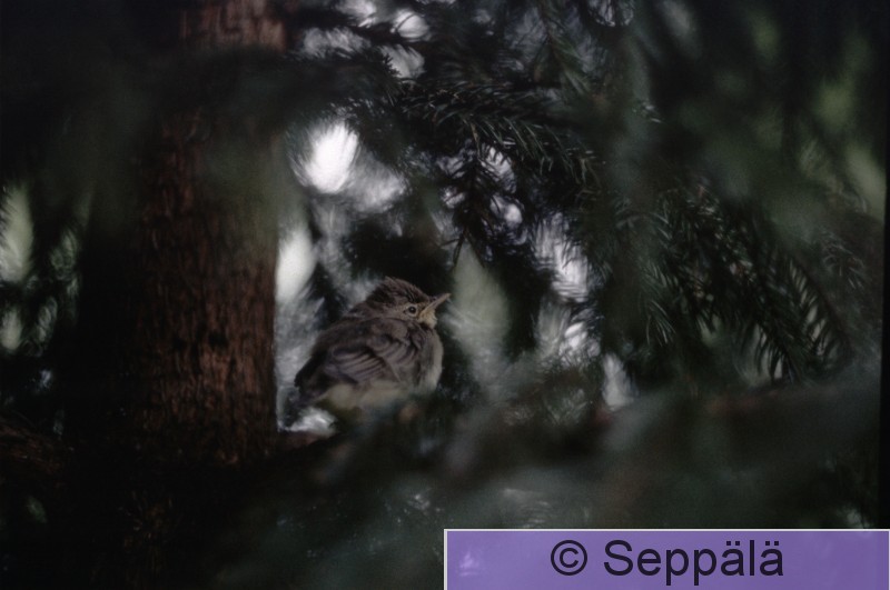 Raasepori Rågö Kultarinnan juuri pesästä lähtenyt poikanen kuusen sisällä.