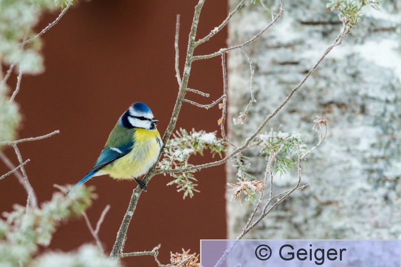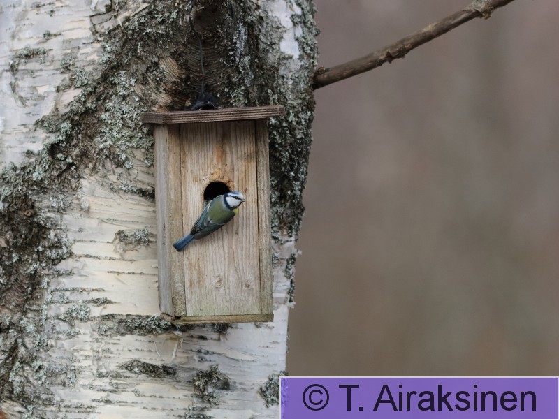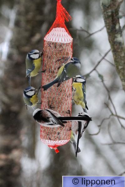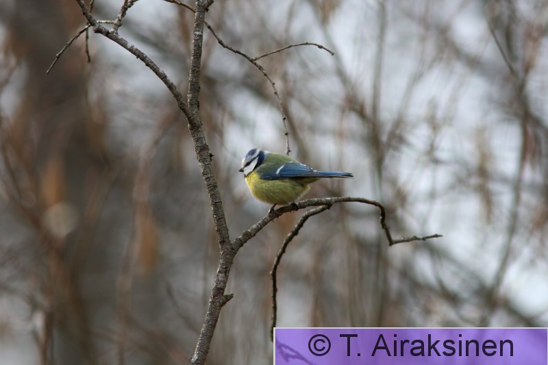 Sastamala Sinitiainen on kuvattu n. -24 asteen pakkasessa. Lintu on pörhistänyt höyhenensä pysyäkseen lämpimänä.