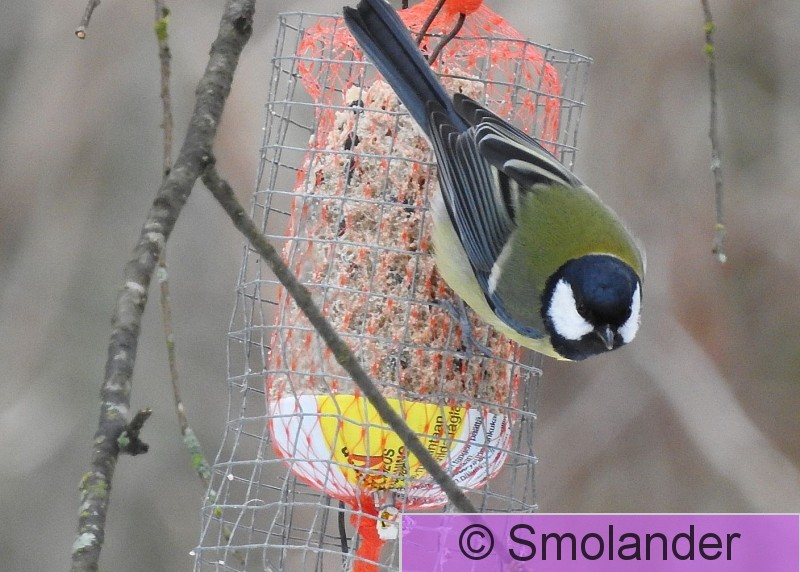 Kangasala Saarikylät Talitiainen tulossa tutkimaan riistakameran pyöreää linssiä.