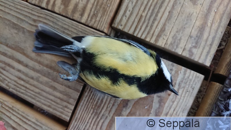 Kangasala Saarikylät Talitiainen tulossa tutkimaan riistakameran pyöreää linssiä.