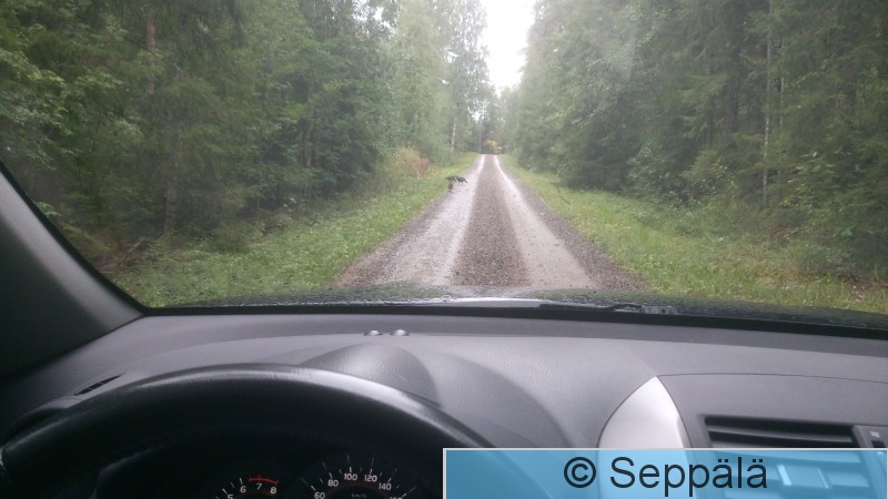 Pälkäne Laipanmaa Kaksi naarasmetsoa ja kaksi koirasta sateessa tiellä kiviä syömässä. Aivan aikuisen näköisiä, mutta toinen naaras oli porukan pomo, joten kyseessä oli poikue. Kännykuva.