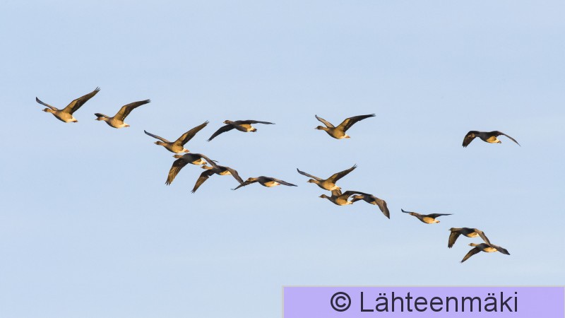 Sastamala Vaunusuo Metsähanhiparvi lennossa - joukossa ainakin yksi tundrahanhi.
