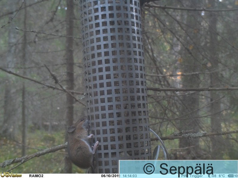 Pälkäne Kurkijoki Orava on syönyt rasvaa ruokintalaitteesta.