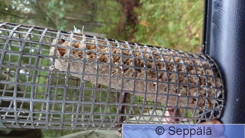 Pälkäne Kurkijoki Kuvassa näkyy paljon myyrän hampaanjälkiä, kun se tai ne ovat käyneet yöllä syömässä kuukkeliruokinnan rasvaa.