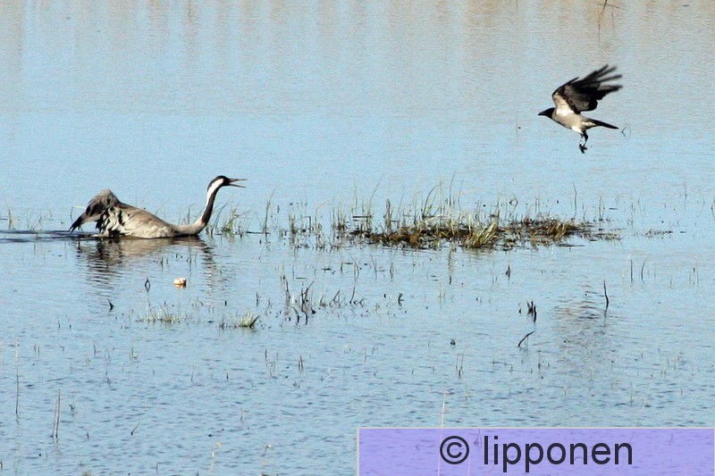 Kauvatsa Puurijärvi Kärjenkallio Varis kiusasi kurkea joka olisi halunnut olla tulva-alueen kahden saarekkeen kuningas. Kurki kahlasi jahdissaan eestaas kun varis vaihtoi vapaalle saarekkeelle.