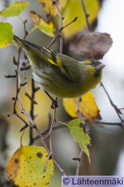 Tampere Iidesjärvi Koiras vihervarpunen etsii syötävää lehtikuusesta, taustalla syksyn keltainen vaahtera.