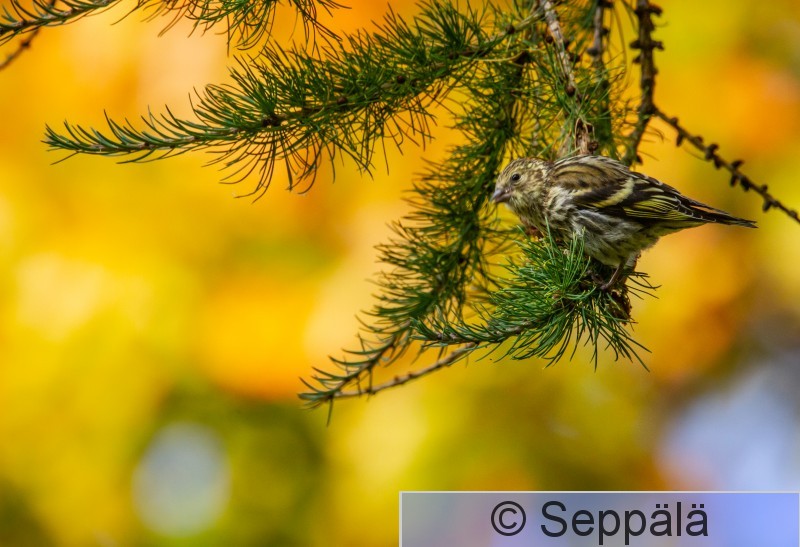 Tampere Iidesjärvi Koiras vihervarpunen etsii syötävää lehtikuusesta, taustalla syksyn keltainen vaahtera.